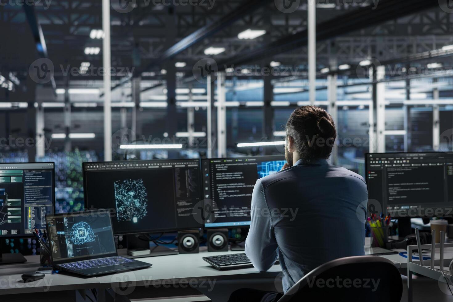 Admin in high tech data center troubleshooting server connectivity issues using AI. IT expert in server farm auditing systems for vulnerabilities using artificial intelligence Pro Photo