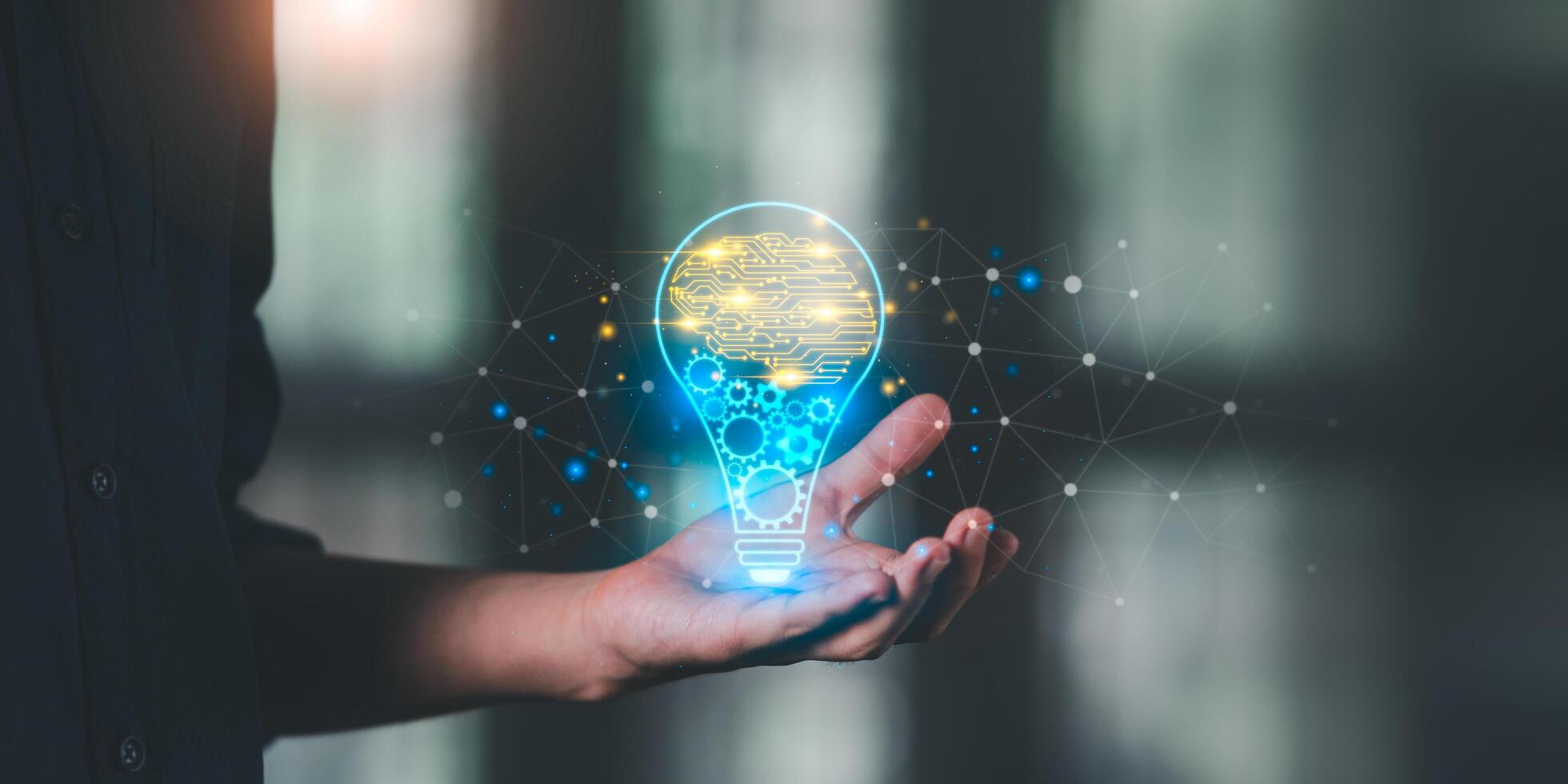 Creative technology idea with glowing digital lightbulb, AI-inspired circuit patterns, and gear symbols, representing tech innovation, futuristic thinking, machine learning, and digital transformation photo