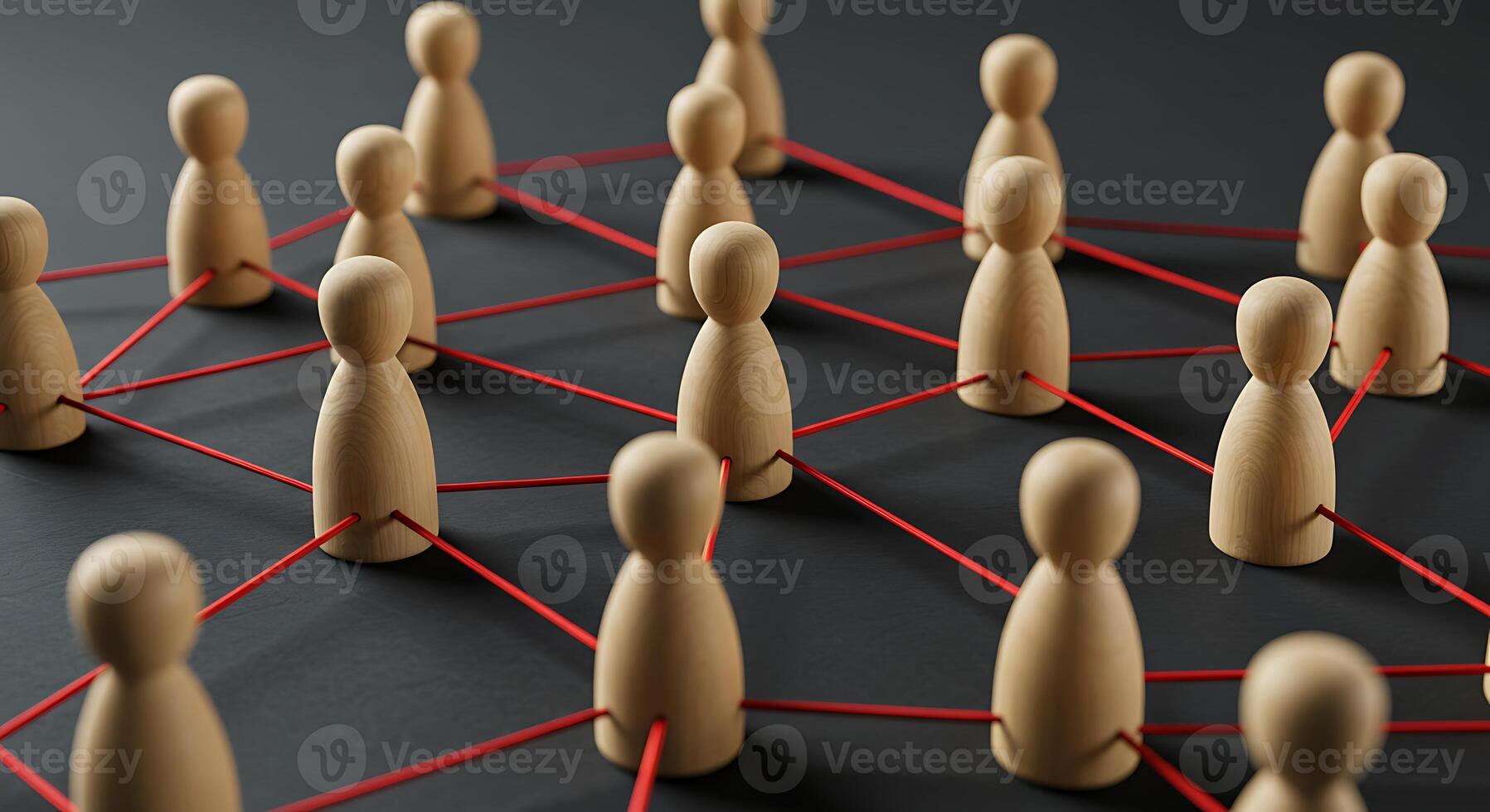 Understanding Digital Connection and Community Building with Wooden Figures Linked by Red Threads Pro Photo