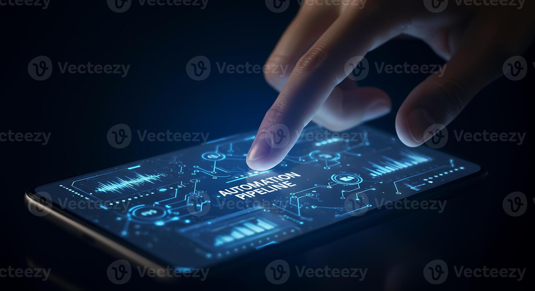 Fingers touching a futuristic glowing digital interface showing complex data visualizations and network connections on a dark background Pro Photo