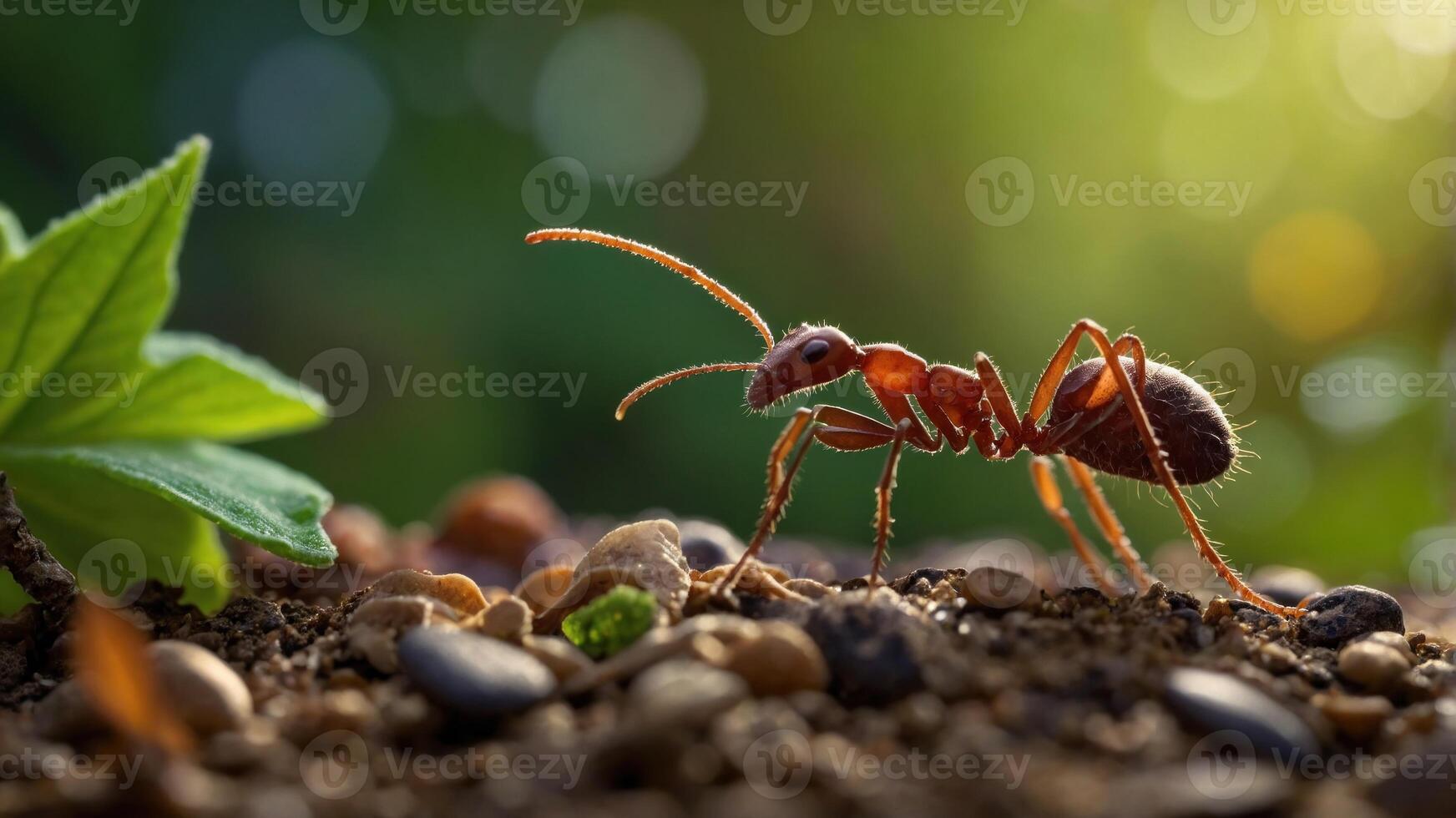 Close-up of an ant navigating through soil and pebbles with lush greenery and soft sunlight in the background Pro Photo