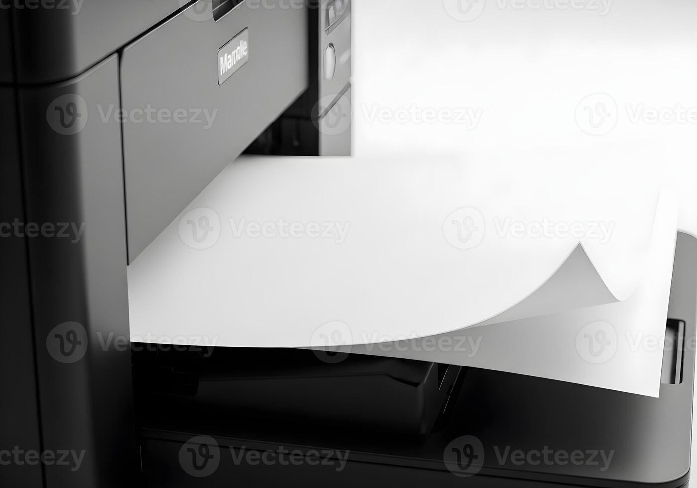 Side view of modern office printer printing blank paper, captured mid-motion with sharp focus, clean background and realistic texture Pro Photo