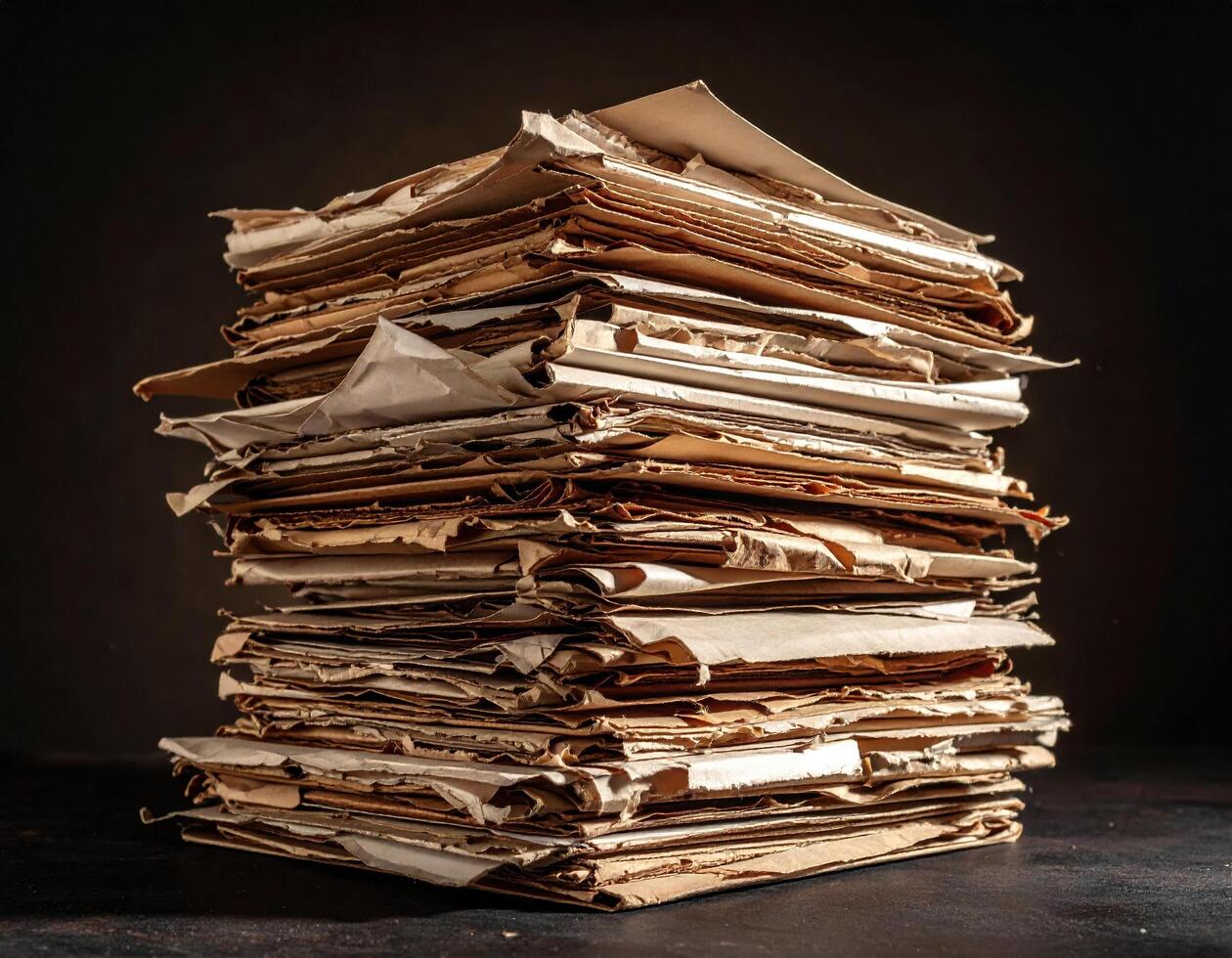 Large stack of crumpled and old paper documents on dark background, evoking sense of nostalgia and history. textures and layers of papers create visually interesting composition photo