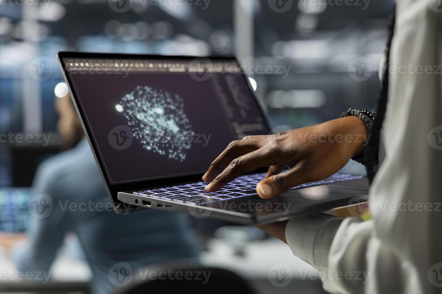 Close up of IT professional in data center using AI LLM assistant on laptop to do maintenance on equipment rigs. Server hub computer scientist using large language model chatbot to do backups Pro Photo