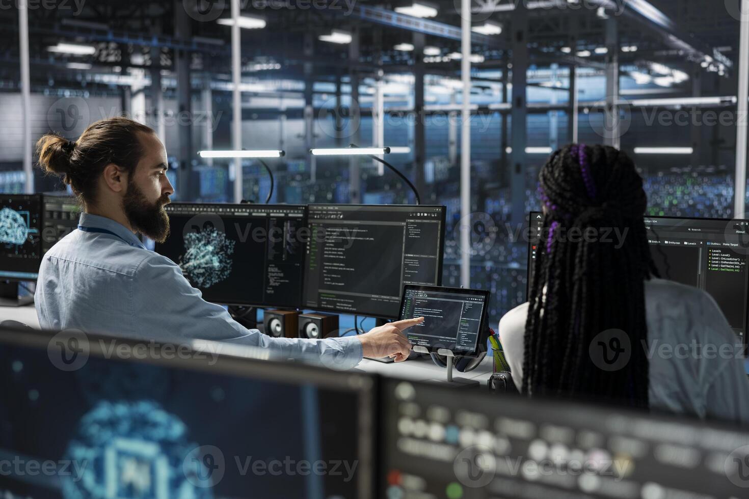 Admins in high tech data center installing upgraded server racks systems helped by AI technology. Server room IT specialists upgrading enterprise networks gear using artificial intelligence Pro Photo