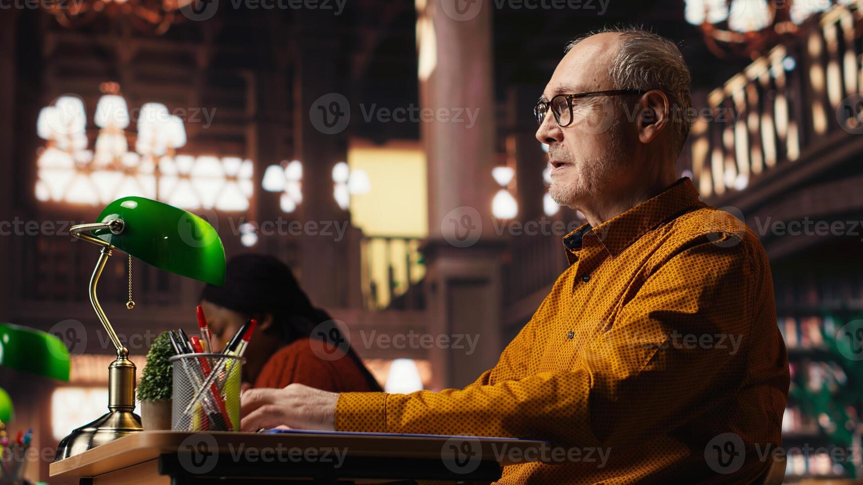 Elderly man with a respiratory problem having a panic attack in the library, struggling to learn due to a discomfort or breathing issue. Senior person in distress, hyperventilation. Pro Photo