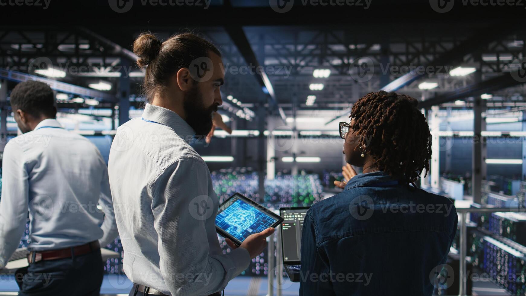 Data center system administrators performing maintenance on supercomputers used for AI. Engineering team managing server hub rigs used for deep learning training, Pro Photo