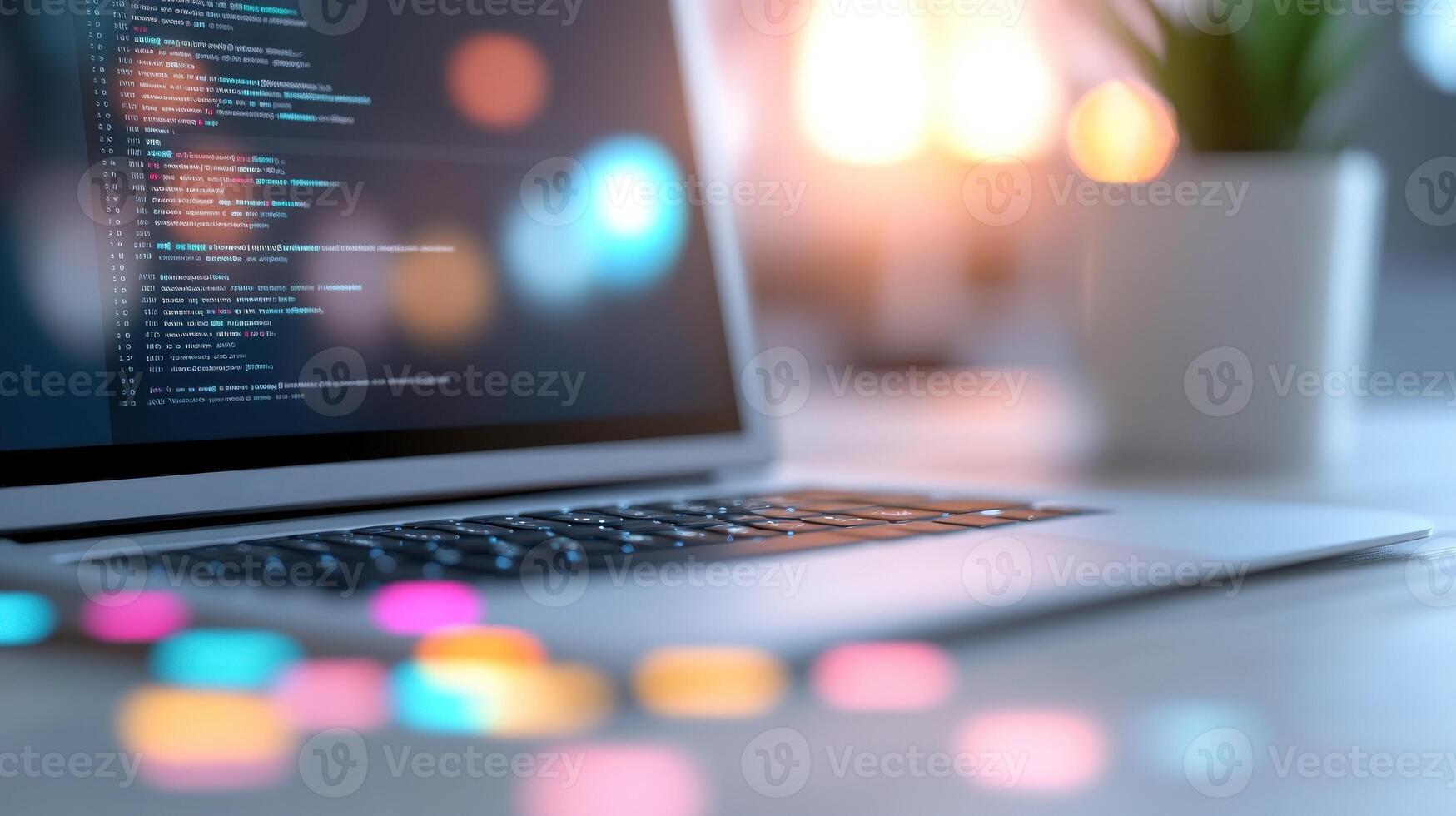 Closeup of a laptop with code displayed on the screen, with a blurred background of colorful bokeh lights and a potted plant. Pro Photo