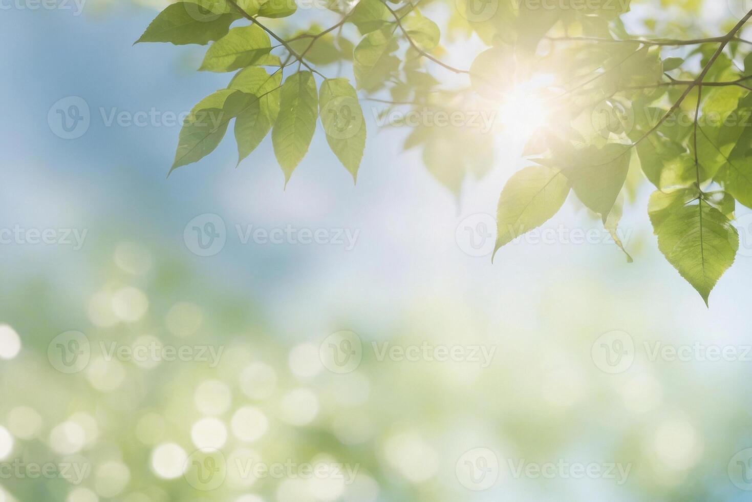 Tree leaves and sun shining on it blue blurred background in subtle bokeh at back Pro Photo