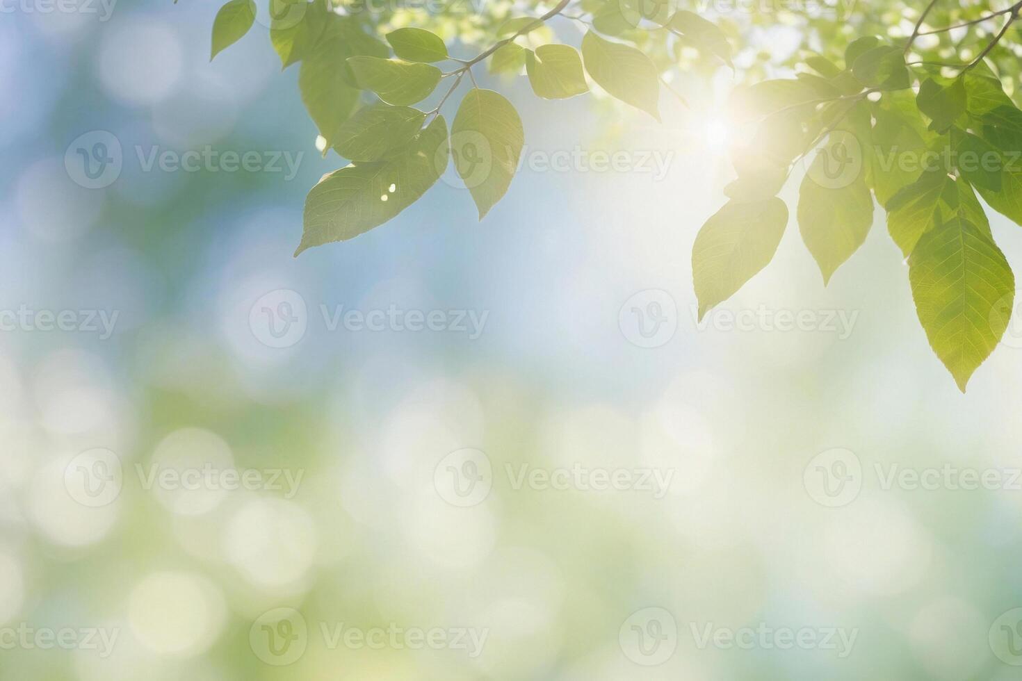 The tree with leaves and sun shining on it blue blurred background in subtle bokeh at back and space for text Pro Photo