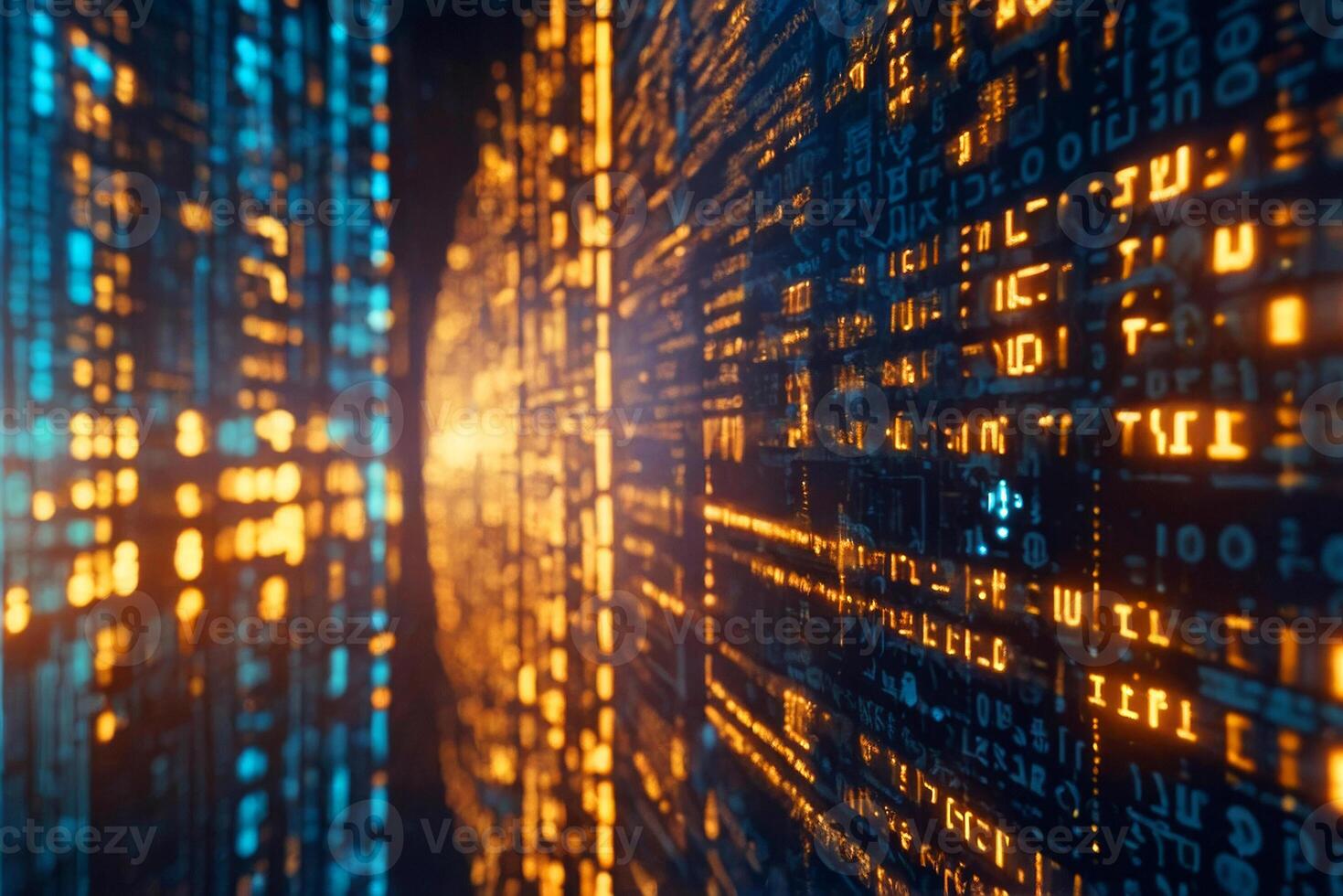 Digital blue interface with pixelated data stream, binary code, and encryption concept with glowing dots Pro Photo