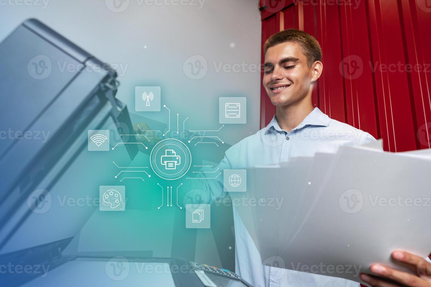 Young man using a printer in a modern office setting while managing documents and printing tasks Pro Photo