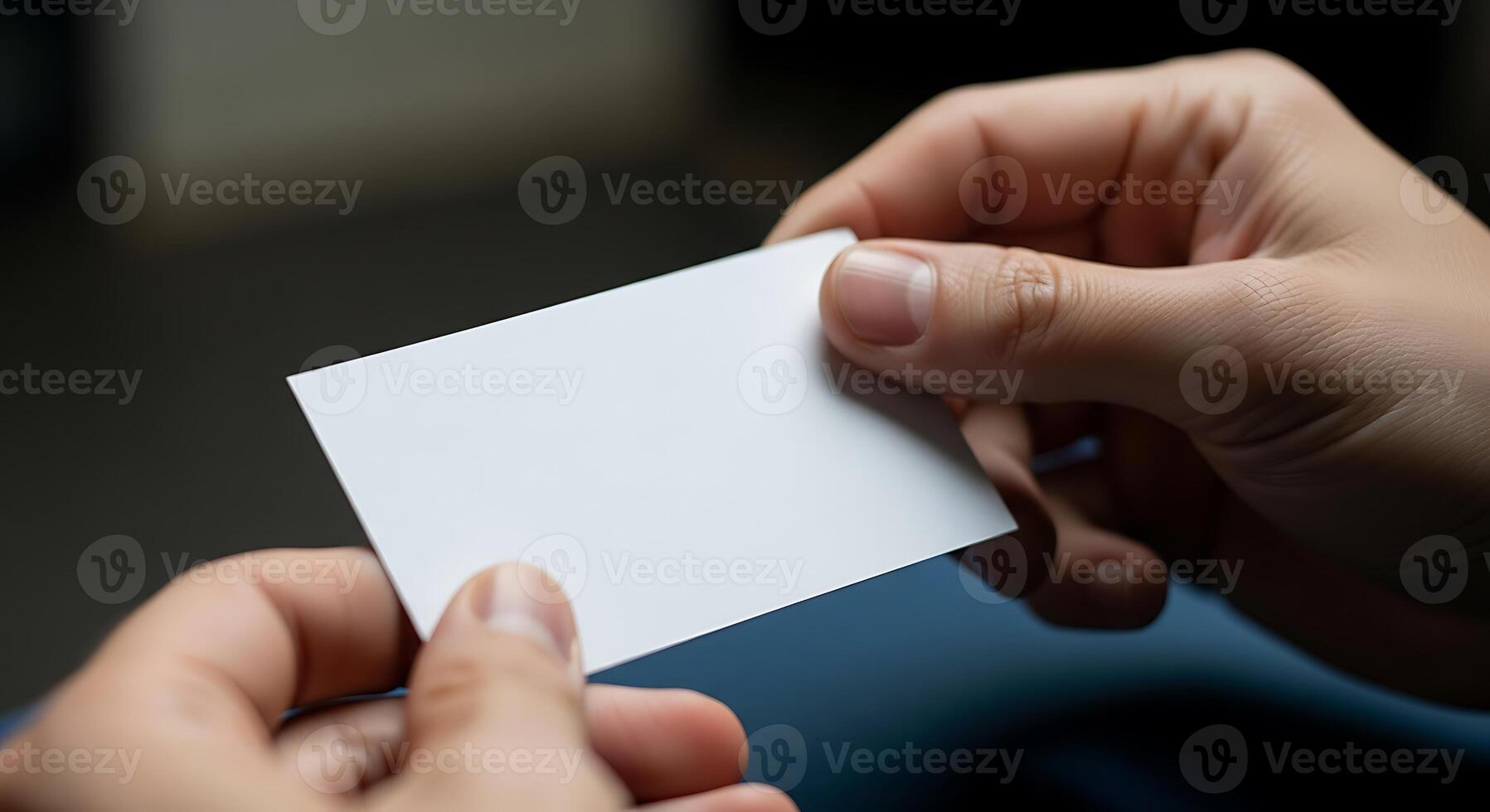 Close-up of hands exchanging a blank business card for networking or introduction Pro Photo