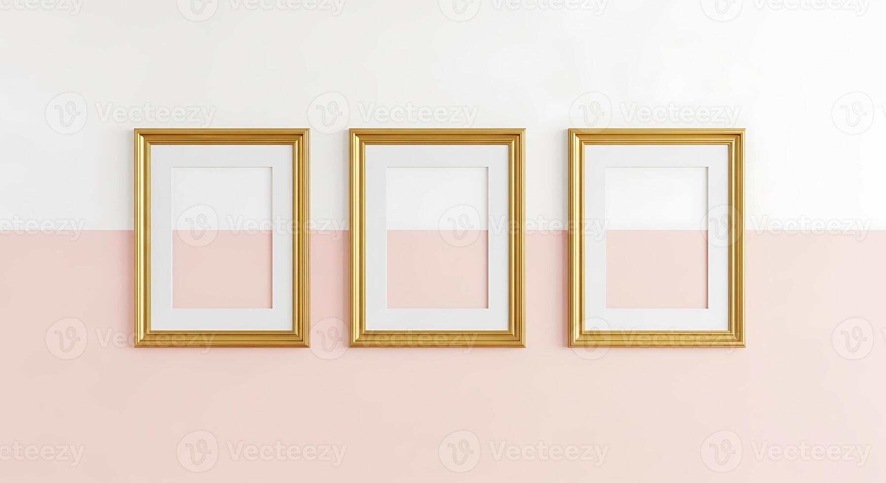 Three empty golden framed rectangles arranged horizontally on a neutral backdrop creating a sense of space Pro Photo