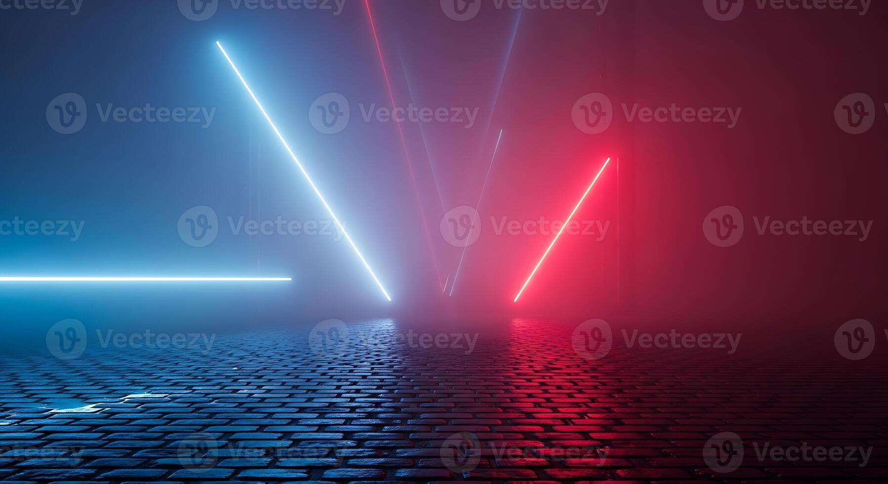 Neon light show abstract background with blue and red rays reflecting on wet surface Pro Photo