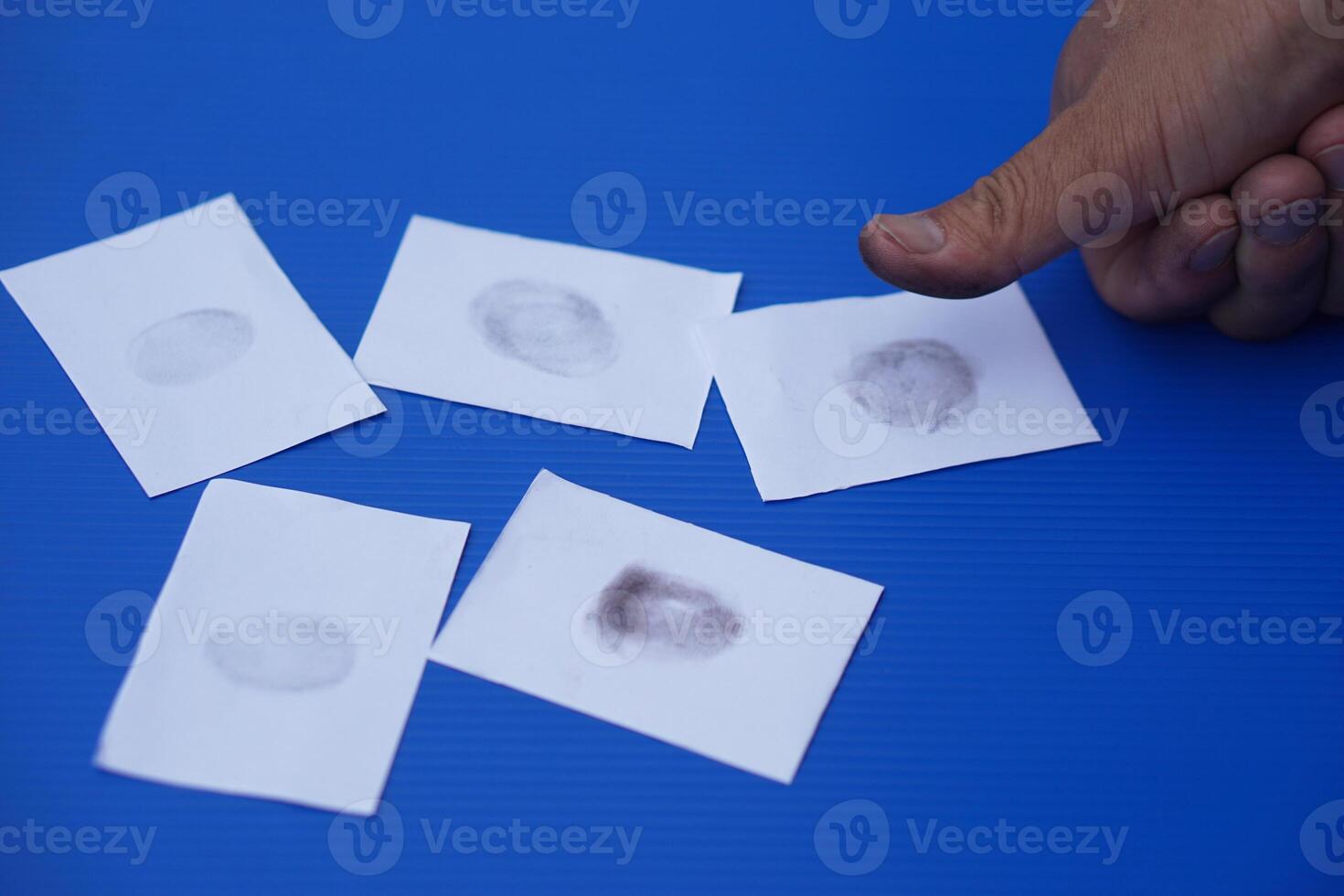 Close-up of fingerprint identification process. A person inked thumb is used to print on white paper cards, symbolizing personal identification, forensic evidence, and biometric security systems. Pro Photo