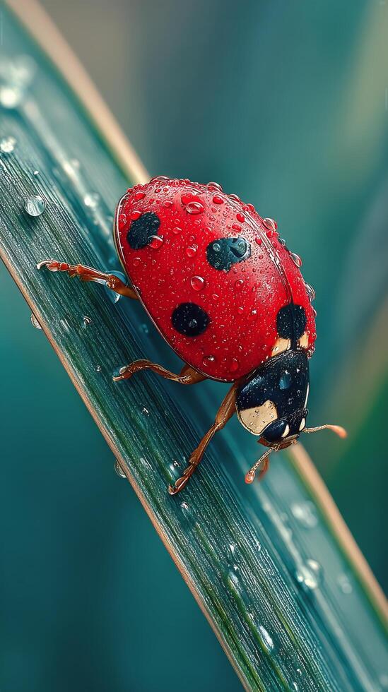Red Ladybug Resting on a Leaf Covered in Droplets After Rain in a Garden photo