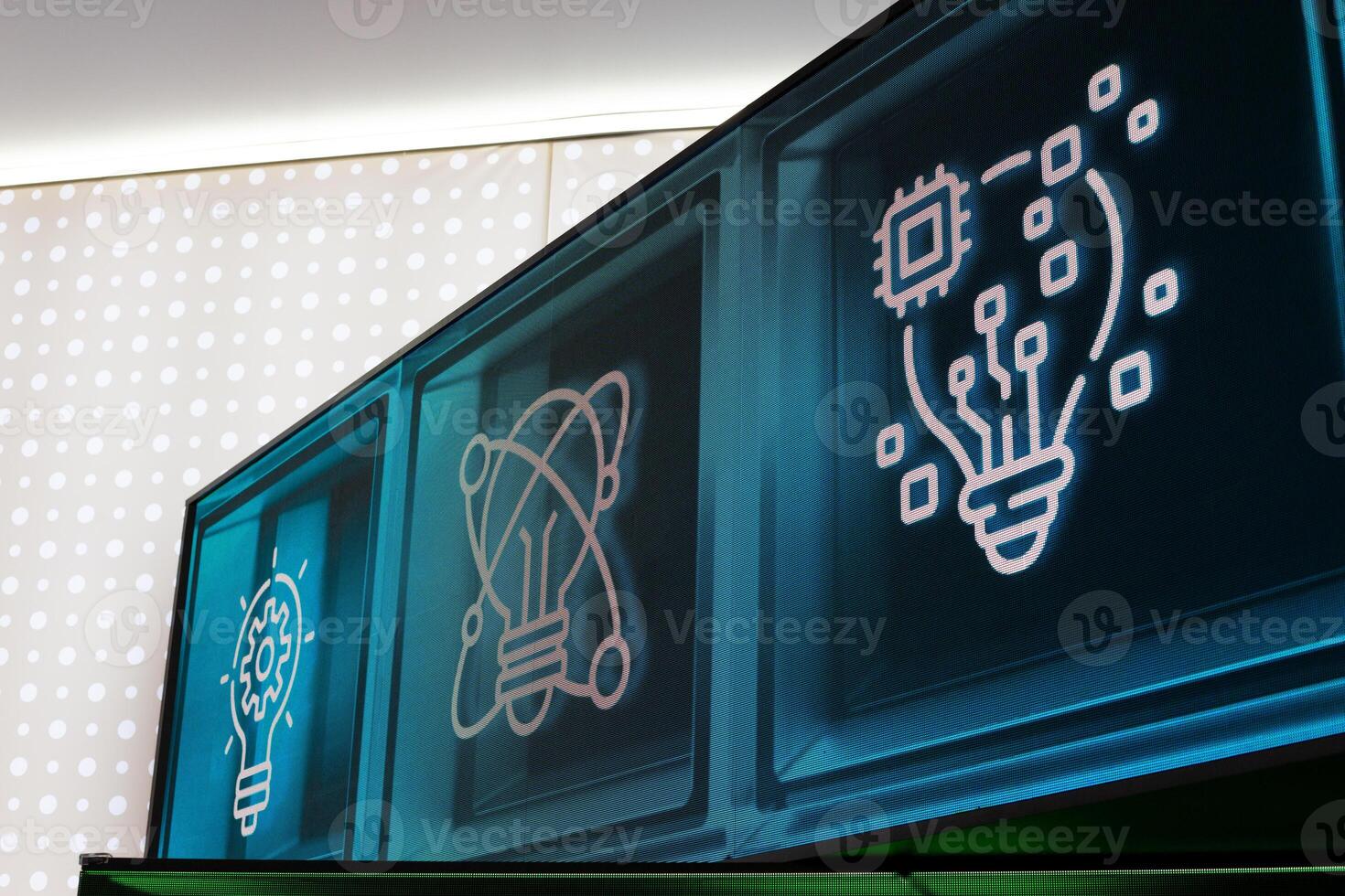 Digital display featuring illuminated icons symbolizing innovation, technology, and creativity. Glowing lightbulbs, gears, and circuitry represent the fusion of science and digital progress Pro Photo