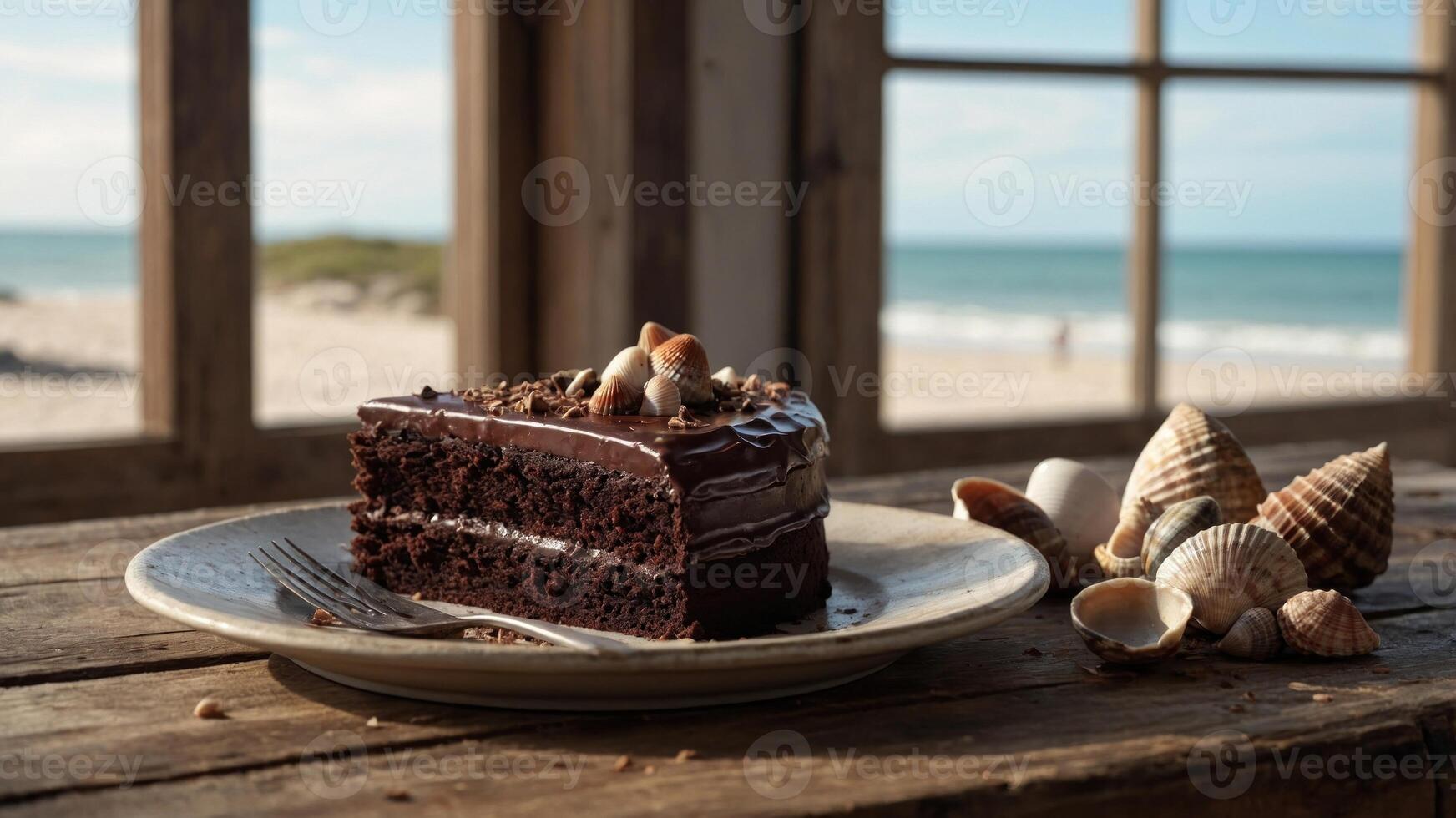 Chocolate cake slice on a rustic plate by a seaside window with shells and beach view Pro Photo