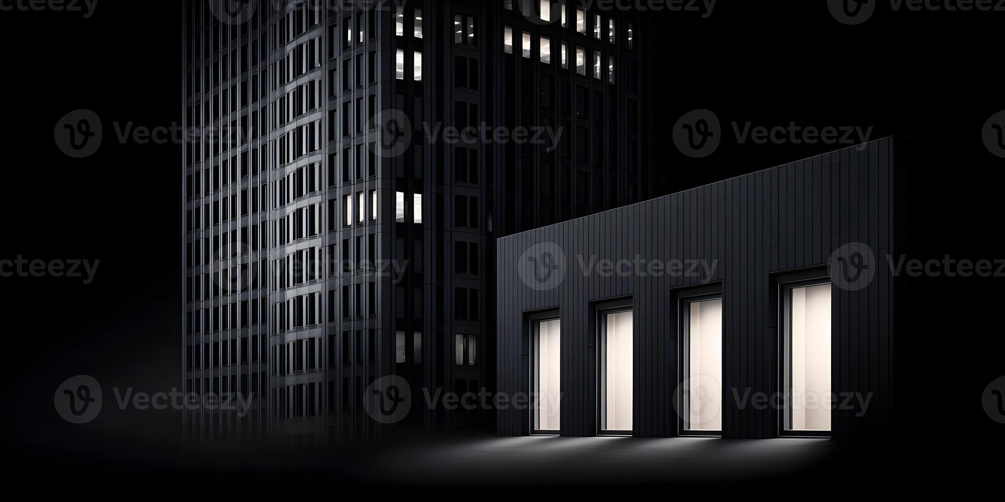 Three illuminated windows in a dark building at night with a tall building in the background Pro Photo