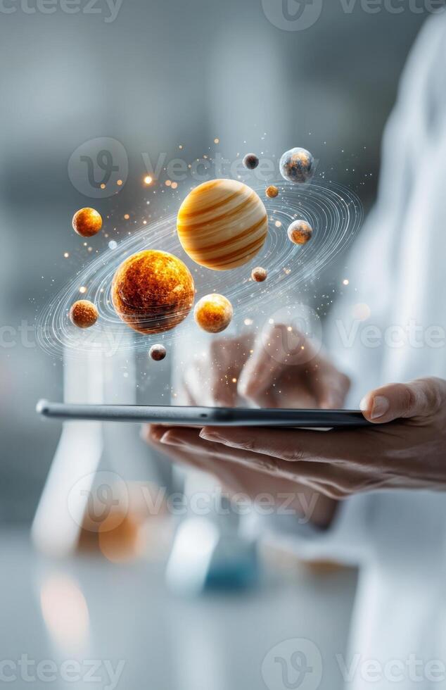 Scientist exploring planets rotating around star on tablet in laboratory Pro Photo