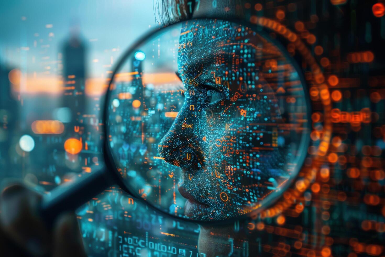 A magnifying glass reveals a digital face composed of binary code and data, representing the interconnectedness of technology and humanity. photo