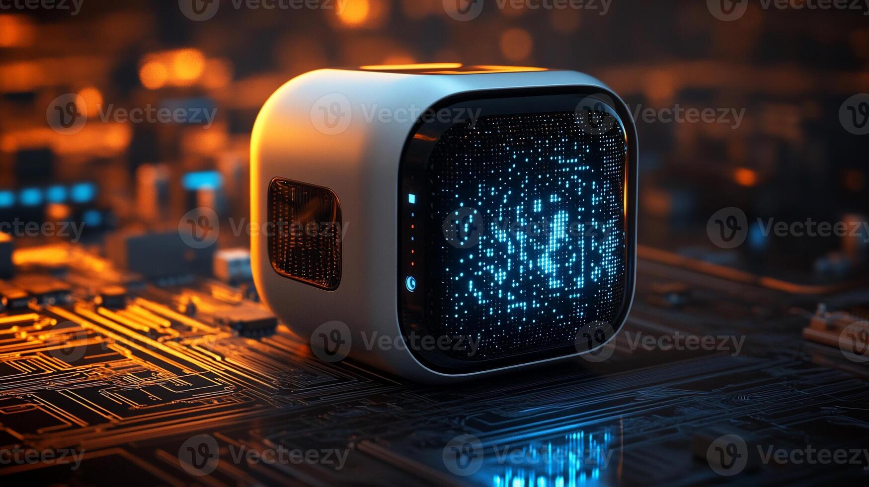 Futuristic cube device displaying data on circuit board. Pro Photo