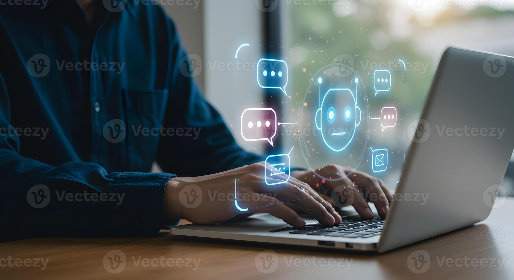 Ai chatbot technology concept person using laptop with ai assistant for communication and automation Pro Photo