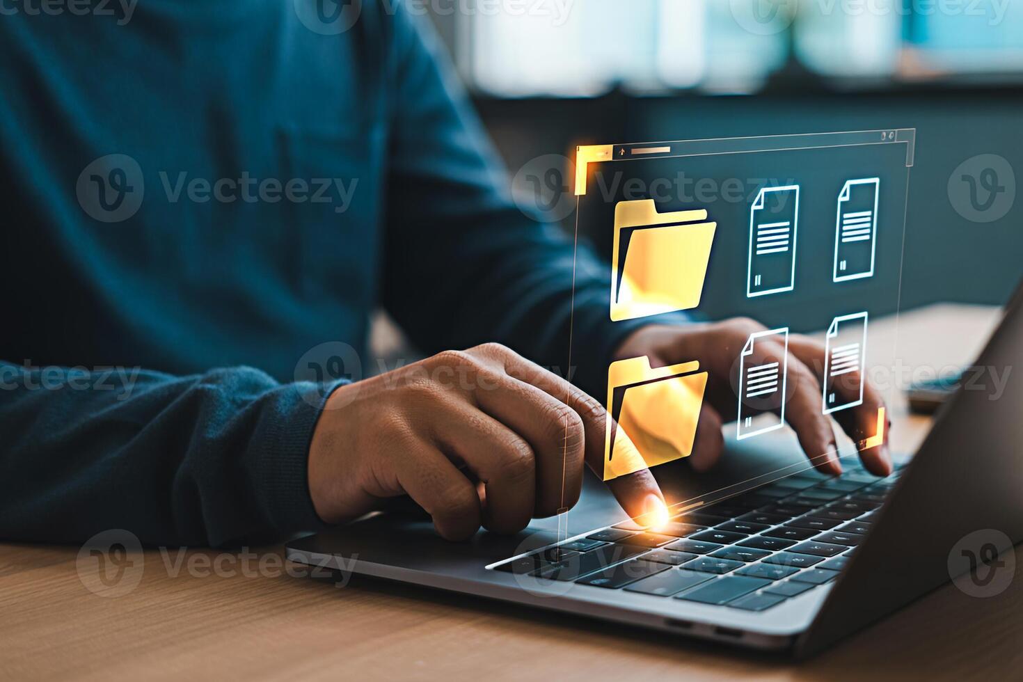 Data management on laptop concept person using file folder document transfer cloud computing technology Pro Photo