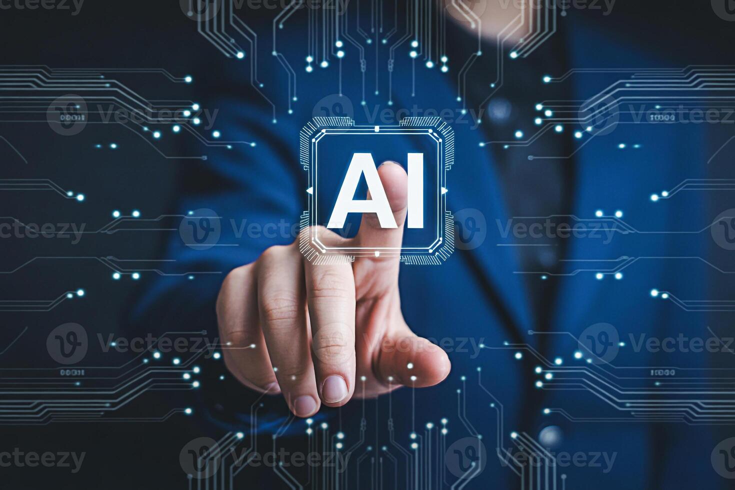 Artificial intelligence ai technology concept with circuit board and man touching screen interface 100 Pro Photo