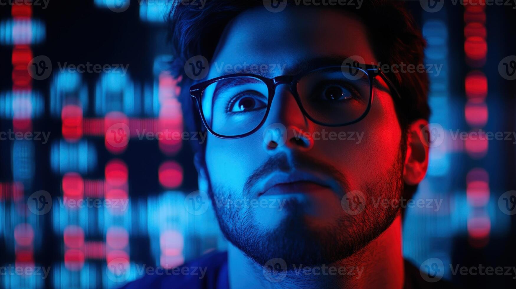 Cybersecurity Specialist A CloseUp Portrait of a Focused Programmer Immersed in the World of Digital Data Streams. Pro Photo