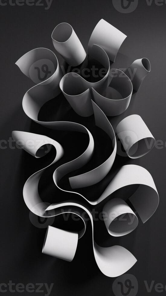 Abstract composition of white paper strips on a dark background, creating an artistic flow and movement. Pro Photo