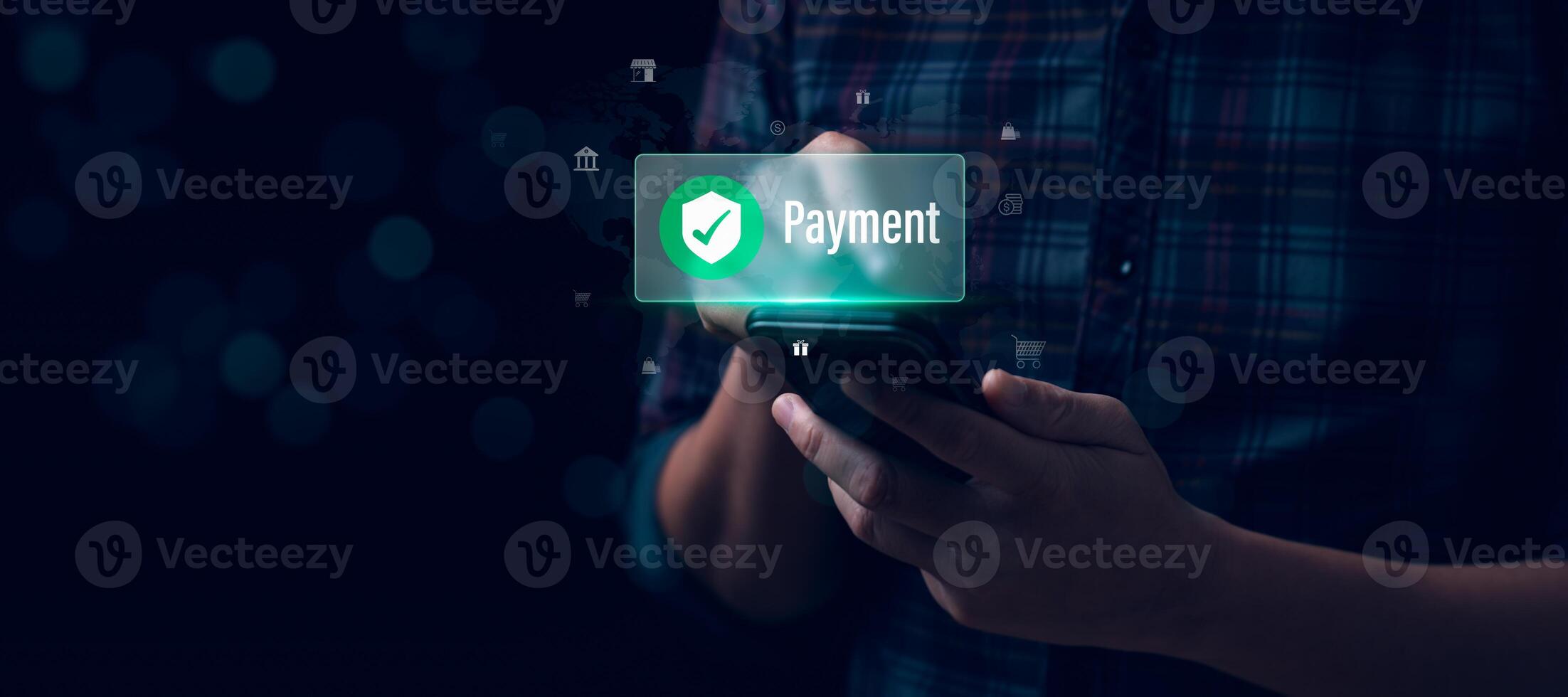 Secure mobile online payment system, Fintech technology for e-commerce, financial transactions, digital wallets and mobile banking concept with secure payment confirmation icon. Pro Photo