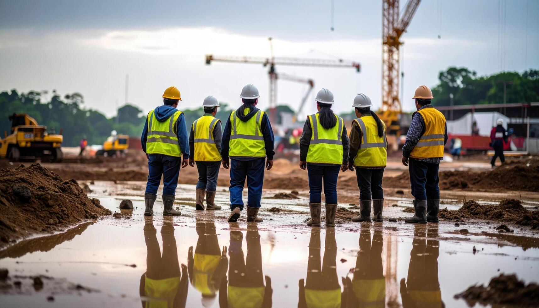 Group of construction workers standing muddy site with safety vests and helmets, overseeing ongoing construction work cloudy sky, reflecting determination and teamwork large scale building project photo