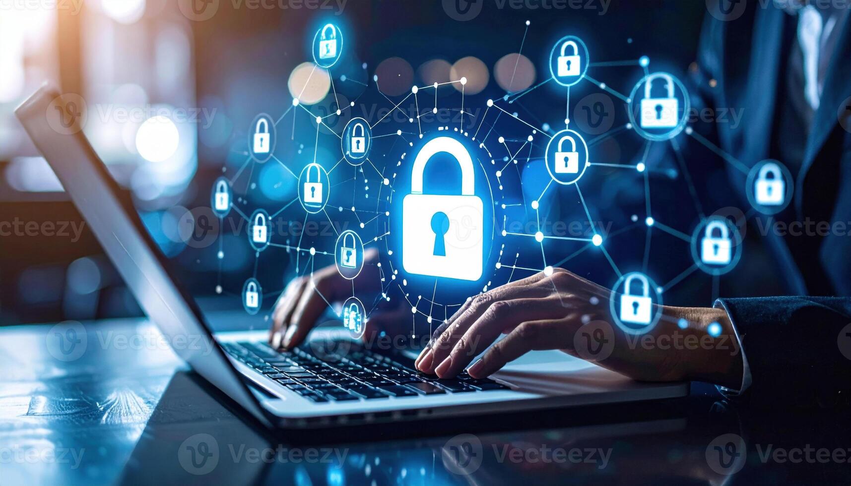 Digital security concept with person using laptop, surrounded by interconnected lock icons symbolizing cybersecurity and data protection, emphasizing online safety and privacy Pro Photo