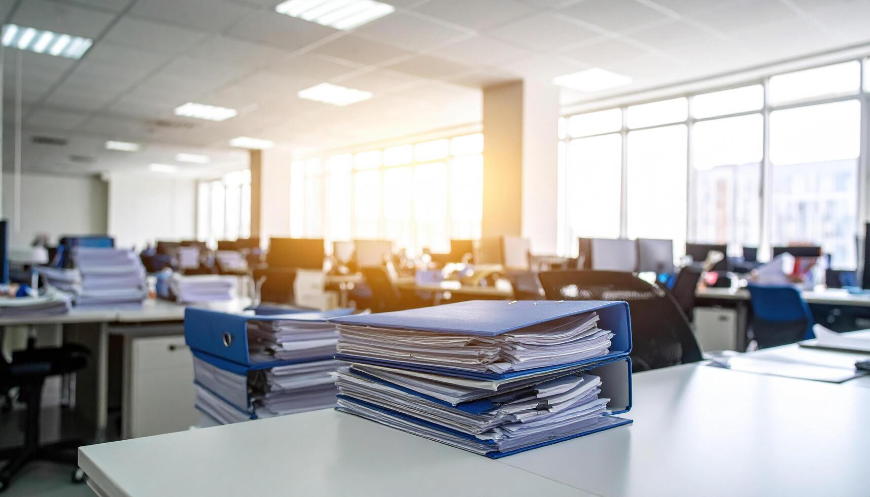 Busy office environment filled with stacks of paperwork and blue binders, showcasing hustle of daily work life. sunlight streams through large windows, creating warm atmosphere Free Photo