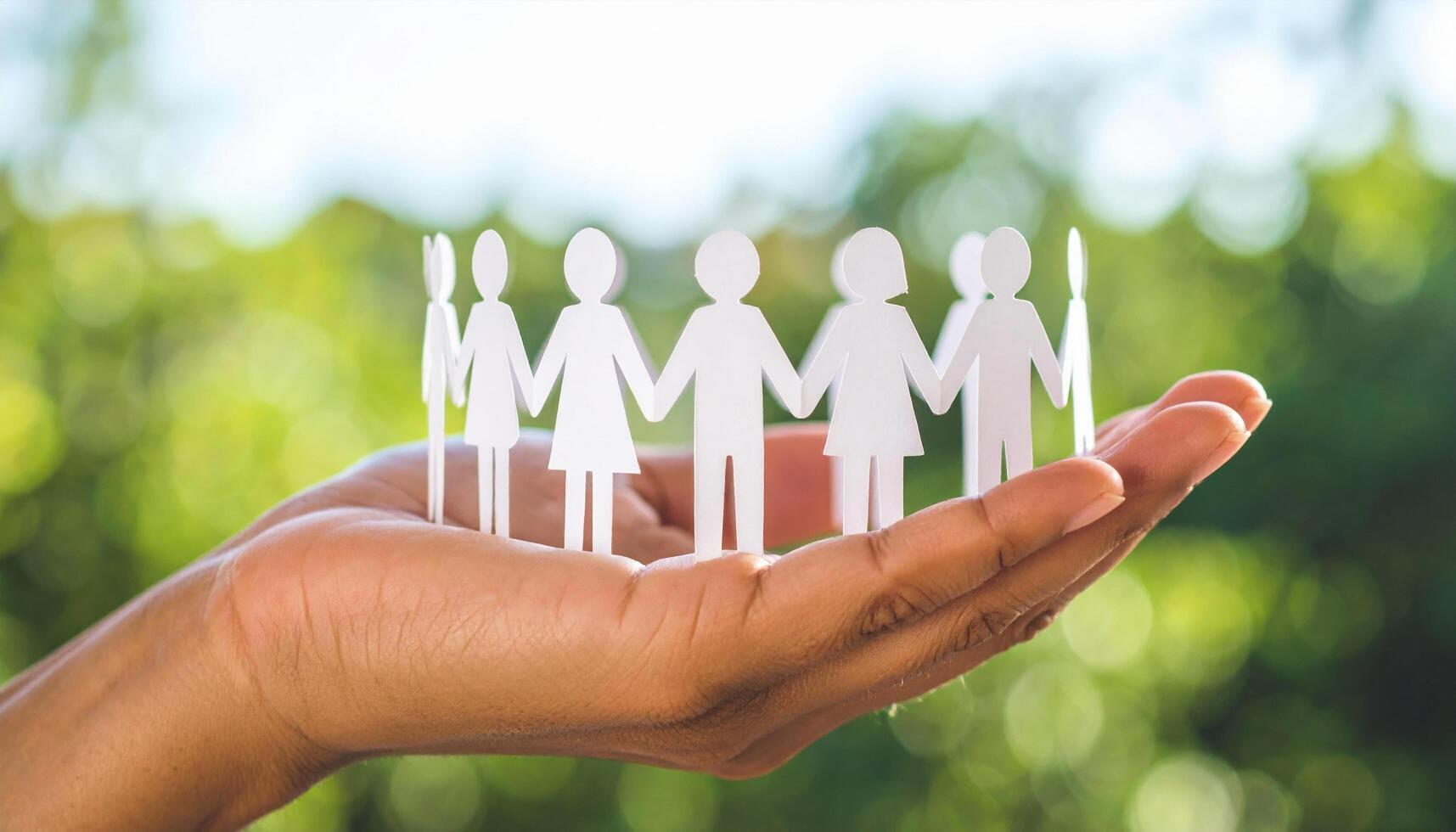 United individuals stand together on open palm, symbolizing unity and diversity. This vibrant scene captures essence of community and collaboration in harmonious setting photo