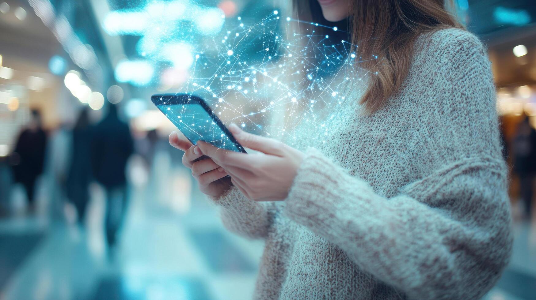 woman using smartphone with digital network overlay in busy space photo