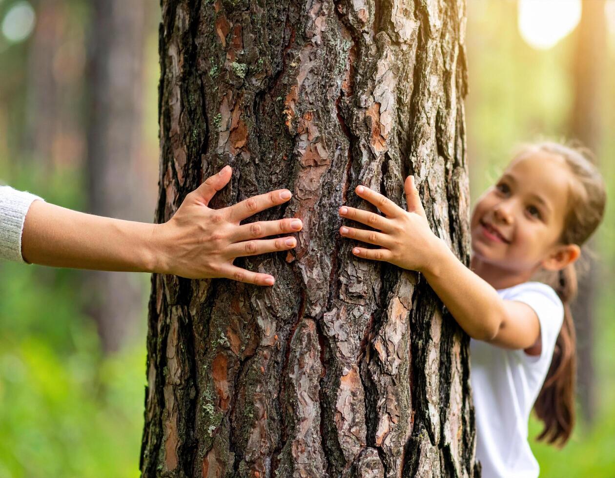 Tender hand reaches out, intertwining with another as child joyfully embraces tree in serene forest setting, showcasing connection with nature photo