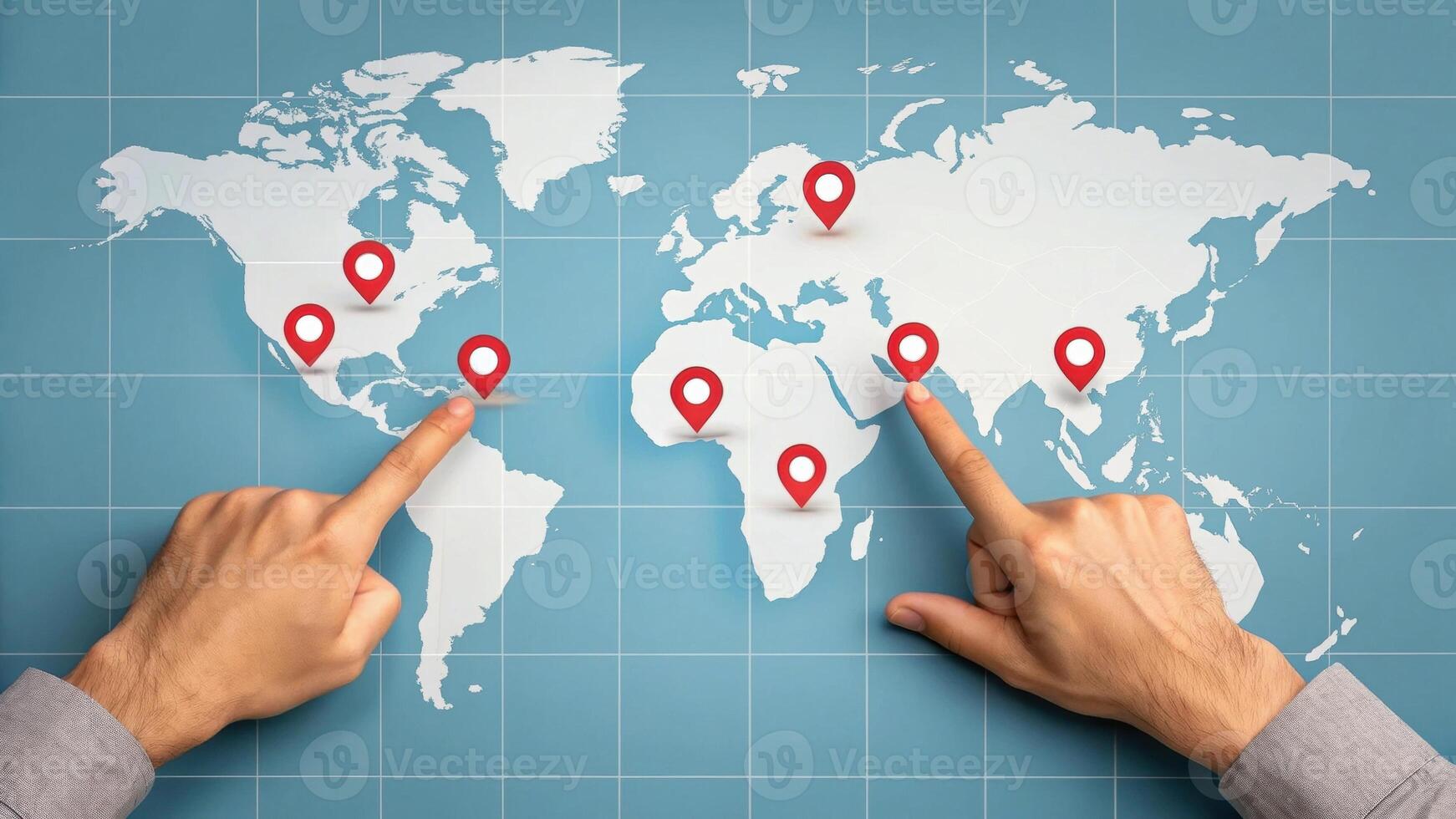 World map with red location markers and two hands pointing at different continents, symbolizing global connection and navigation Pro Photo