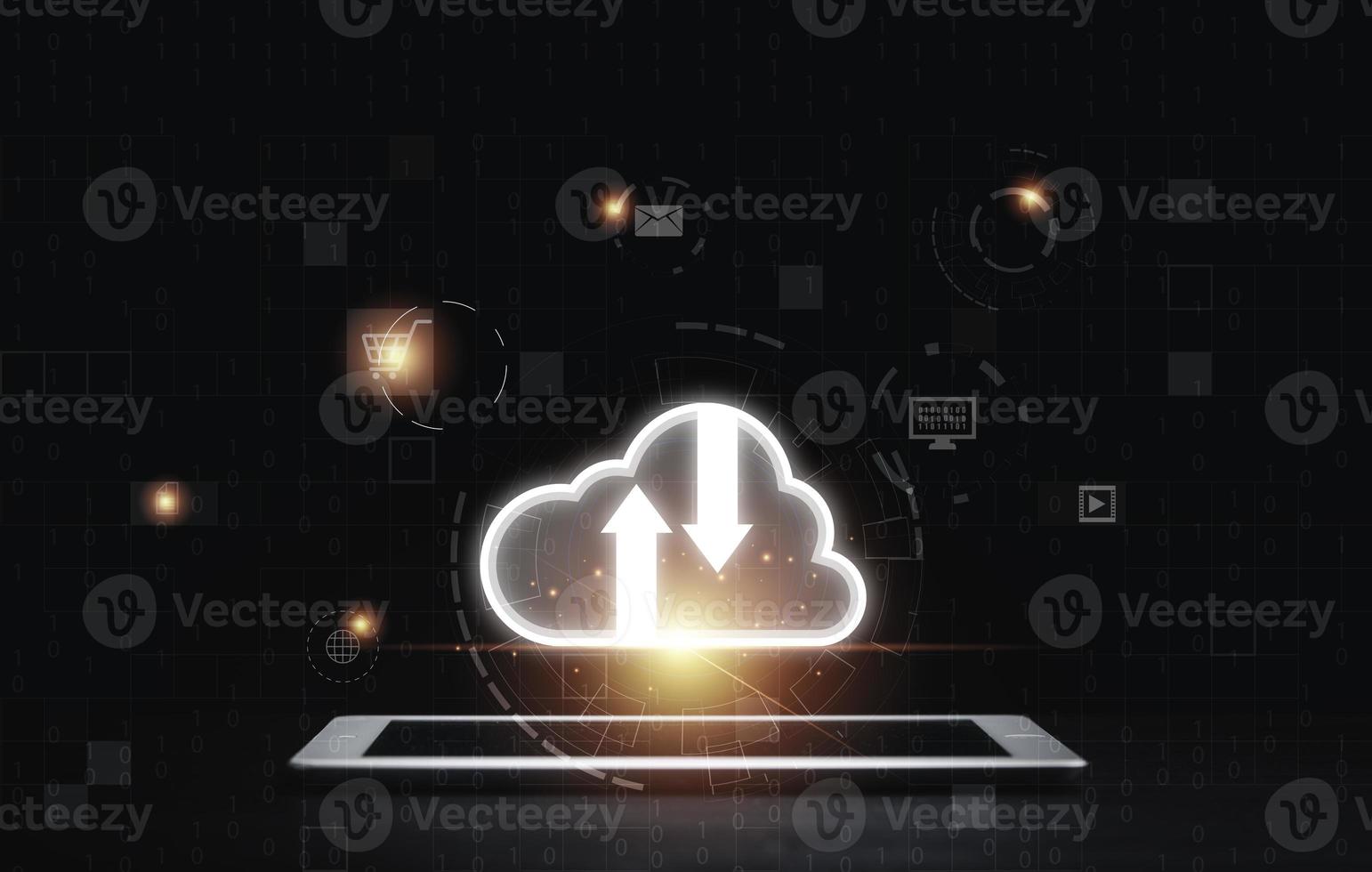 Cloud computing icon on tablet with copy space to transfer data information and upload download application. Technology transformation concept. Pro Photo