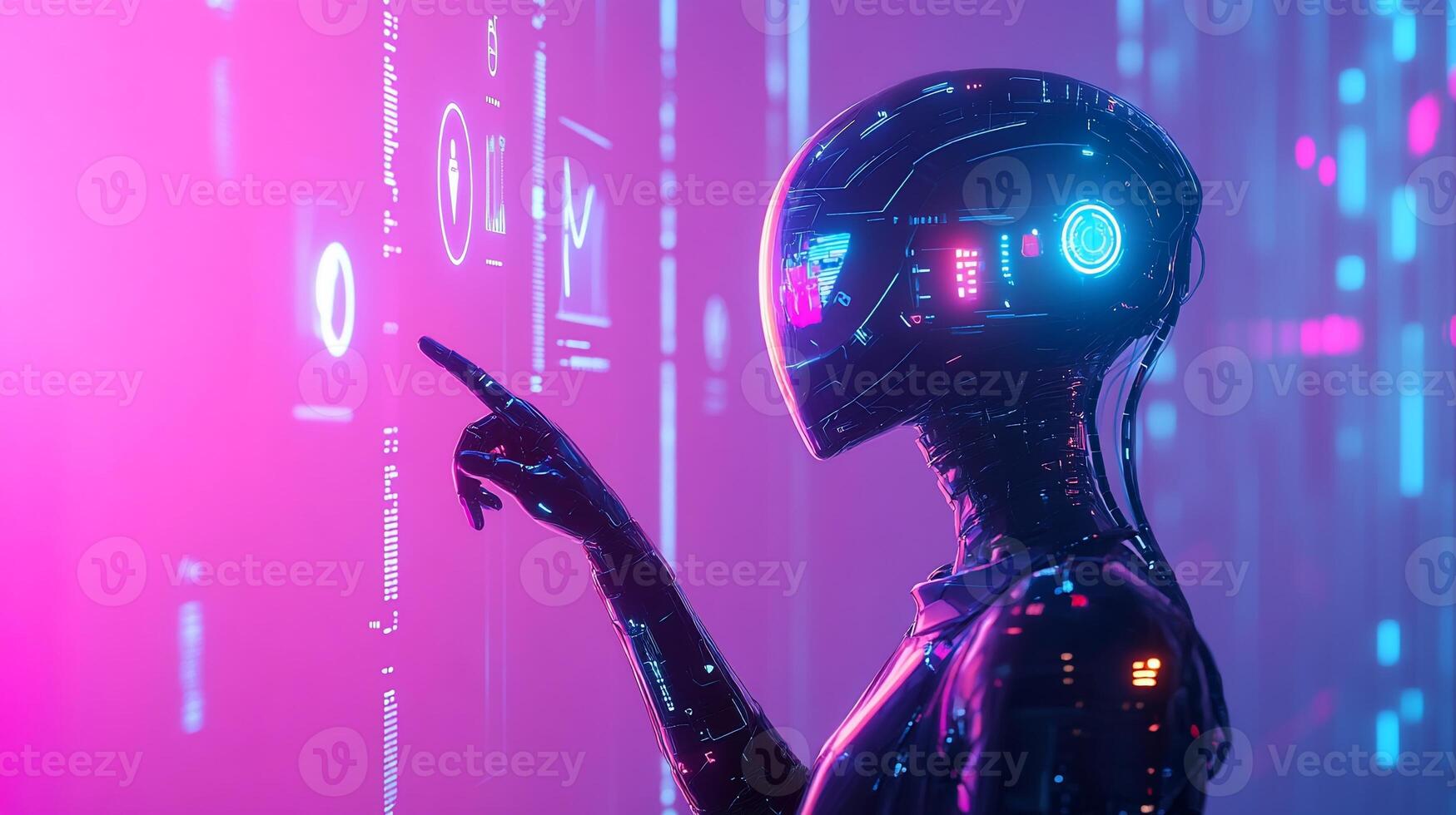 Futuristic robot interacts with a holographic interface, displaying data and graphs. Pro Photo