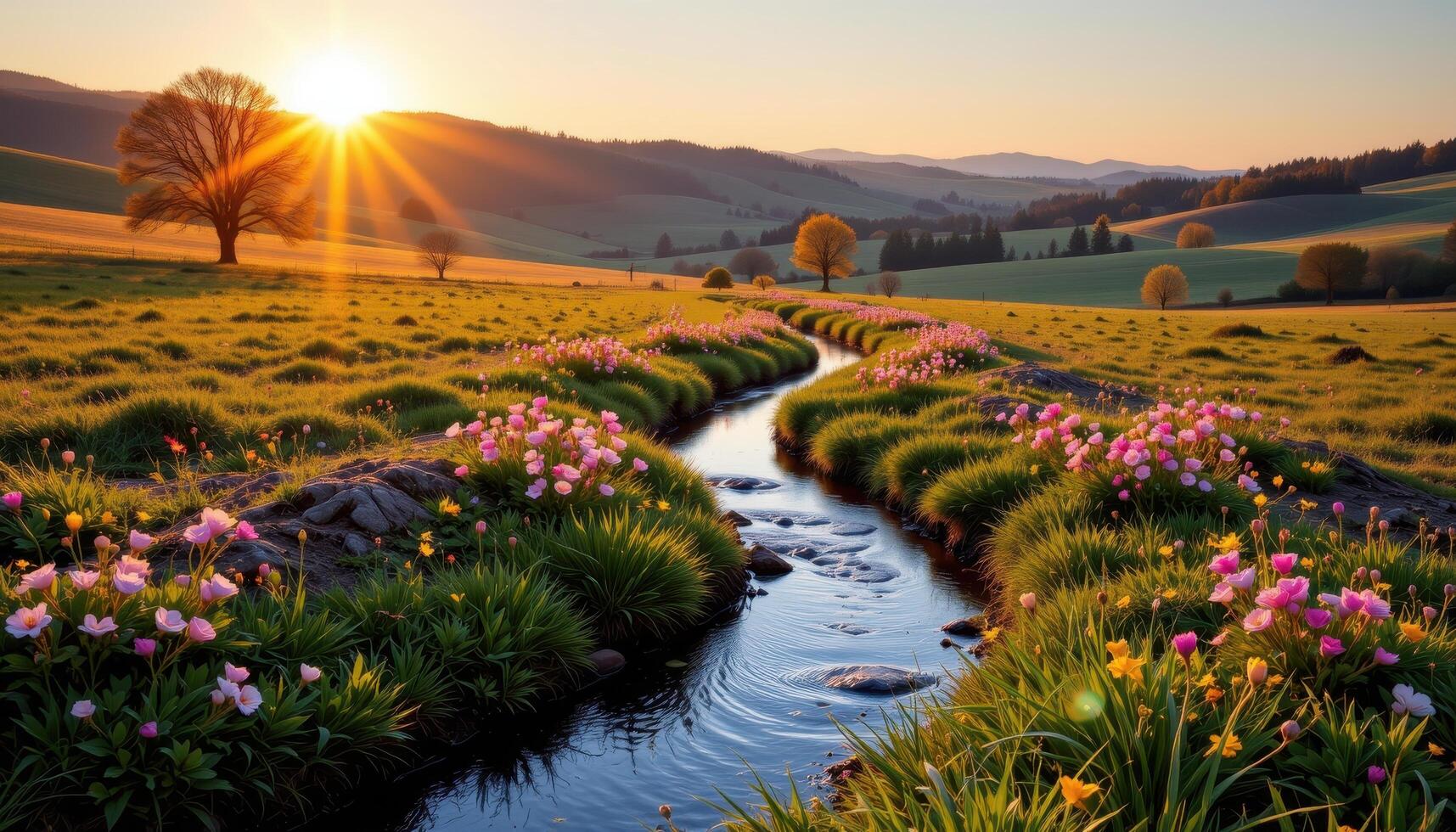 a tranquil stream twists between blooming fields, glowing beneath the warm dawn light of spring. Free Photo