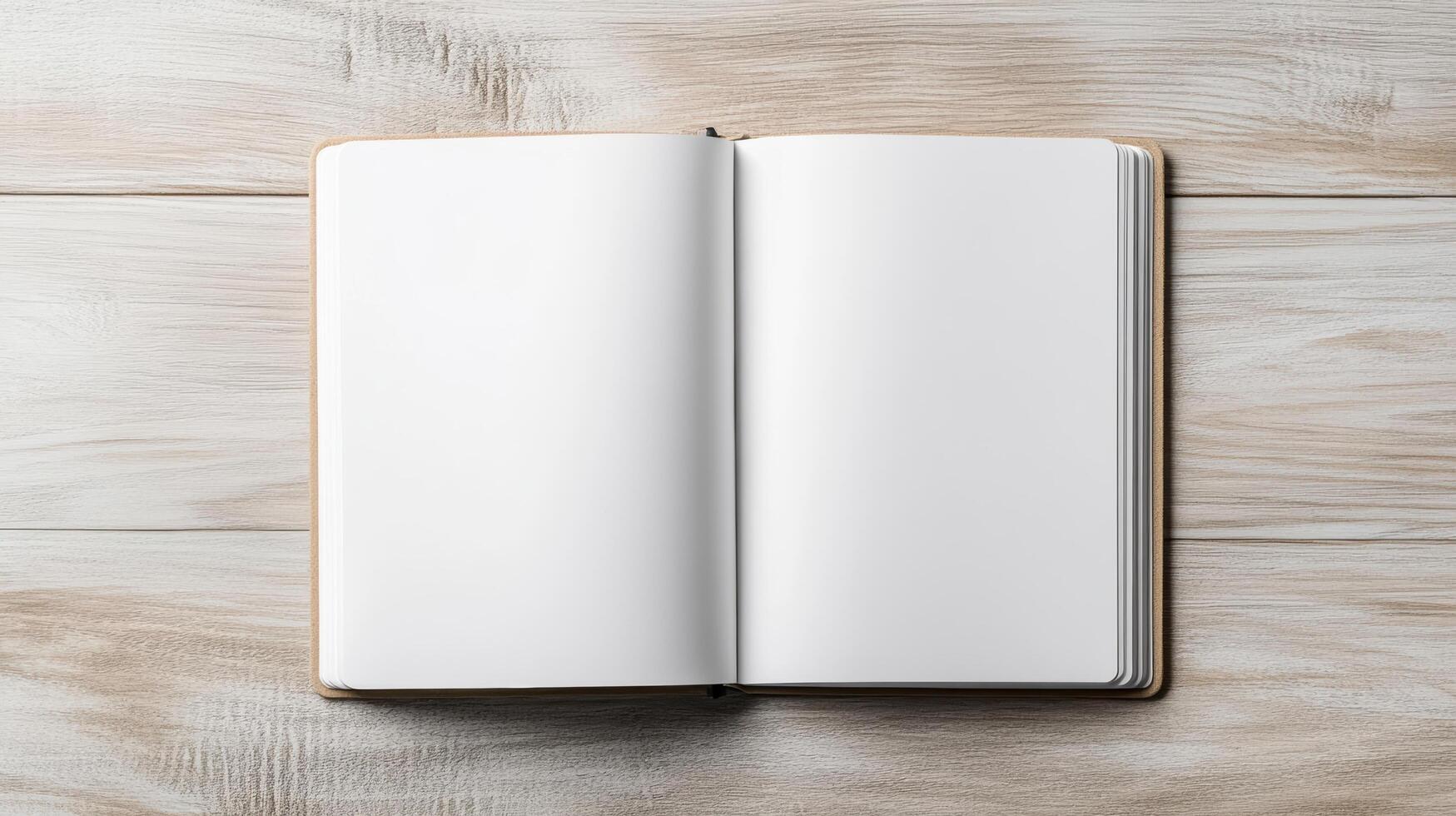Blank notebook with open pages on wooden surface, inviting creativity and ideas photo