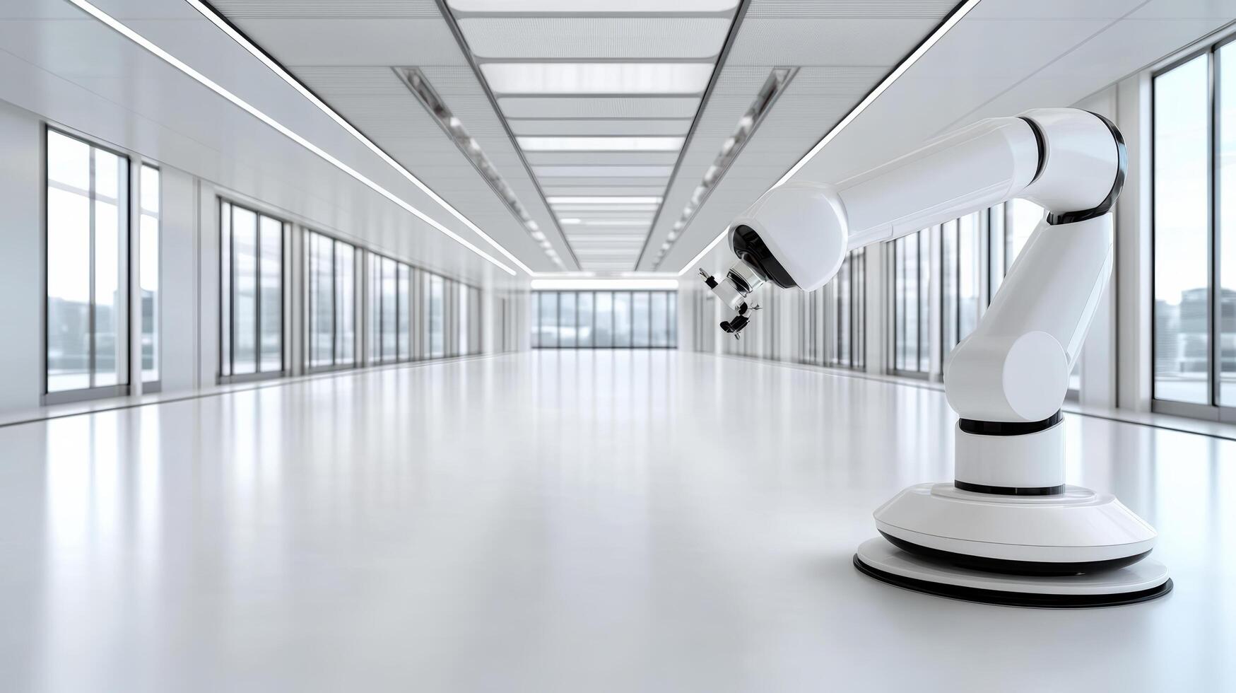 Robotic arm stands modern, spacious environment with large windows, showcasing advanced photo
