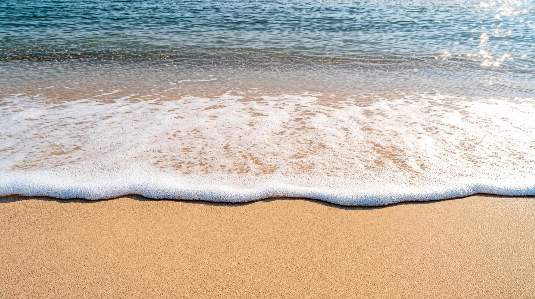 Gentle waves create soft patterns on shimmering beach, inviting relaxation and tranquility photo