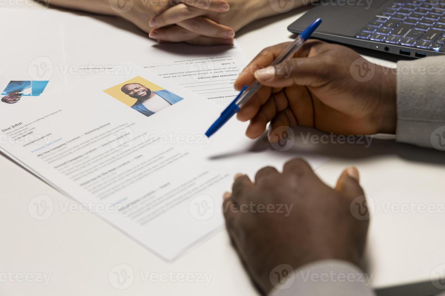 Close up of a CV resume on the table during detailed job interview with applicant and HR manager, reviewing the candidate qualifications and work experience for the selection process. Pro Photo