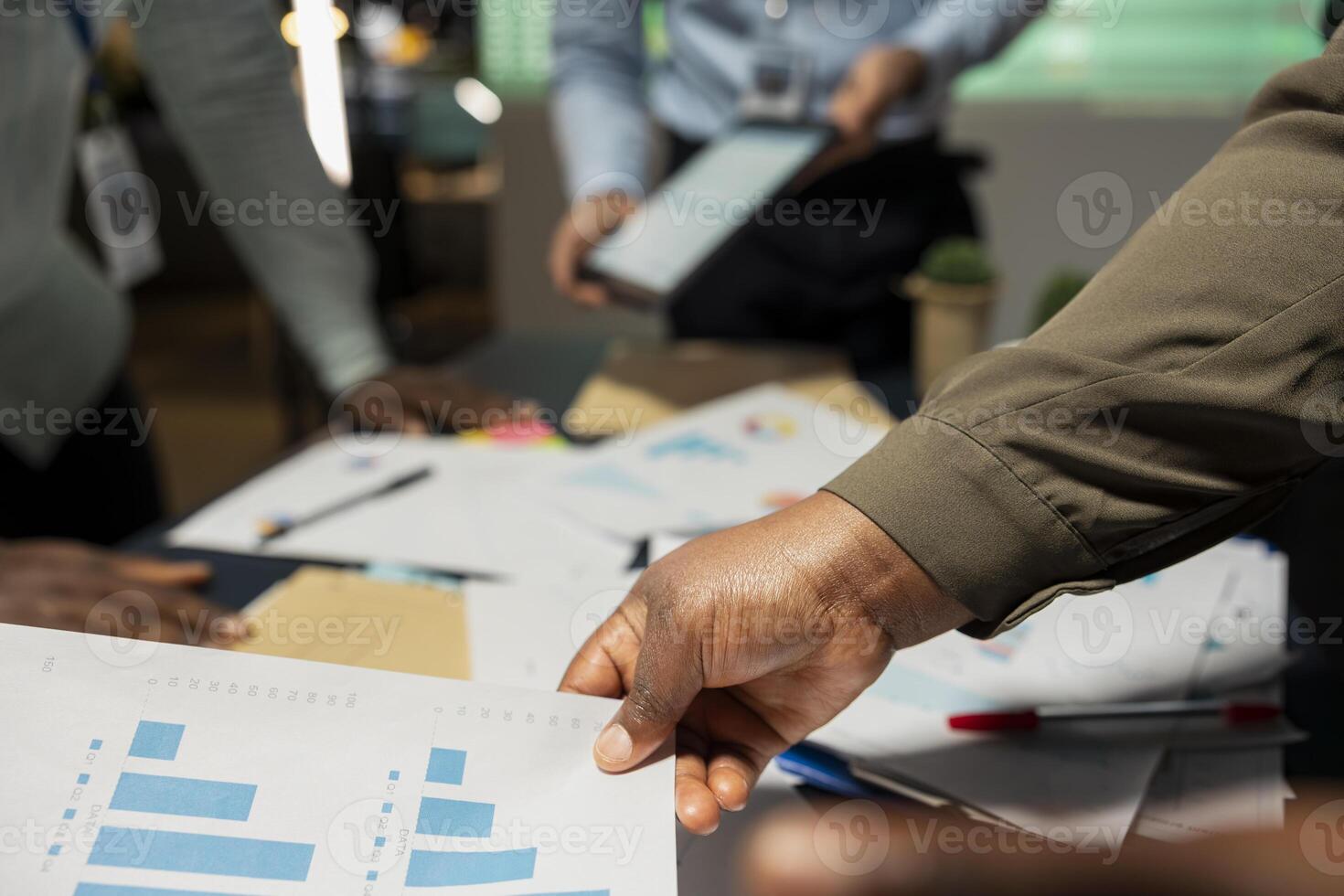 Close up of diverse project team shares analytics reports during advisory board event after hours, reviewing business intel and preparing insight for upcoming presentation with associates. Pro Photo