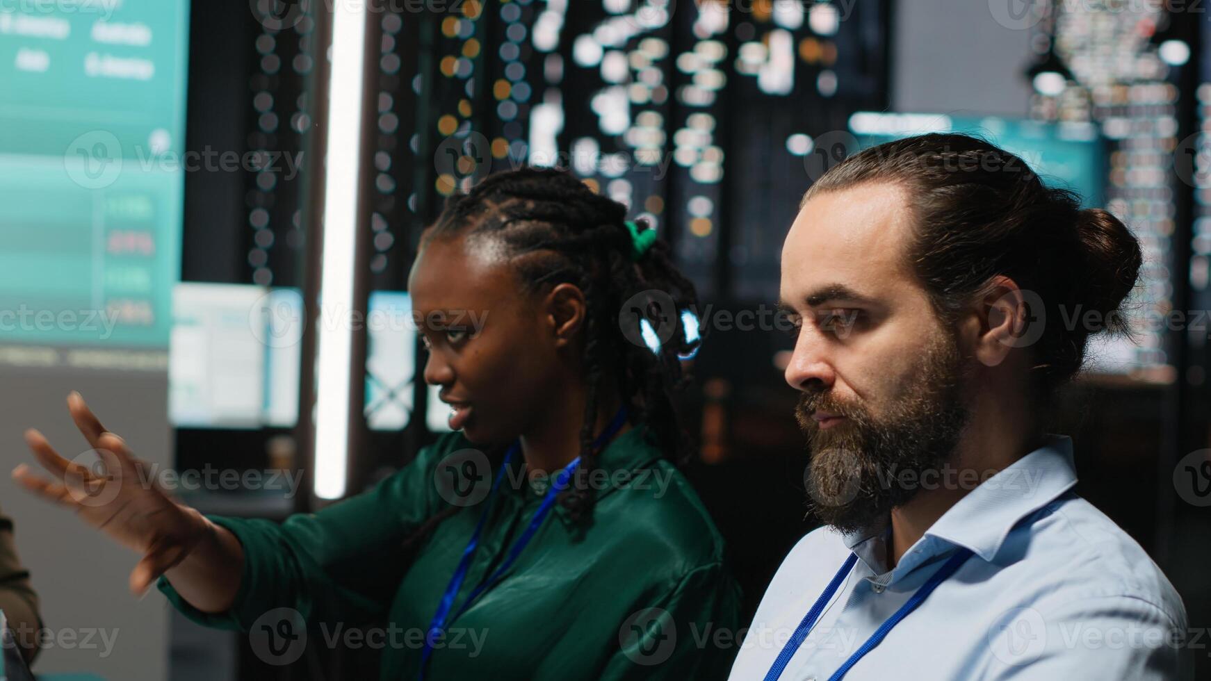 Diverse team of analysts reviewing annual data reports in after hours meeting, developing internal communication to ensure productivity. Working on enterprise development plans. Camera B. Pro Photo