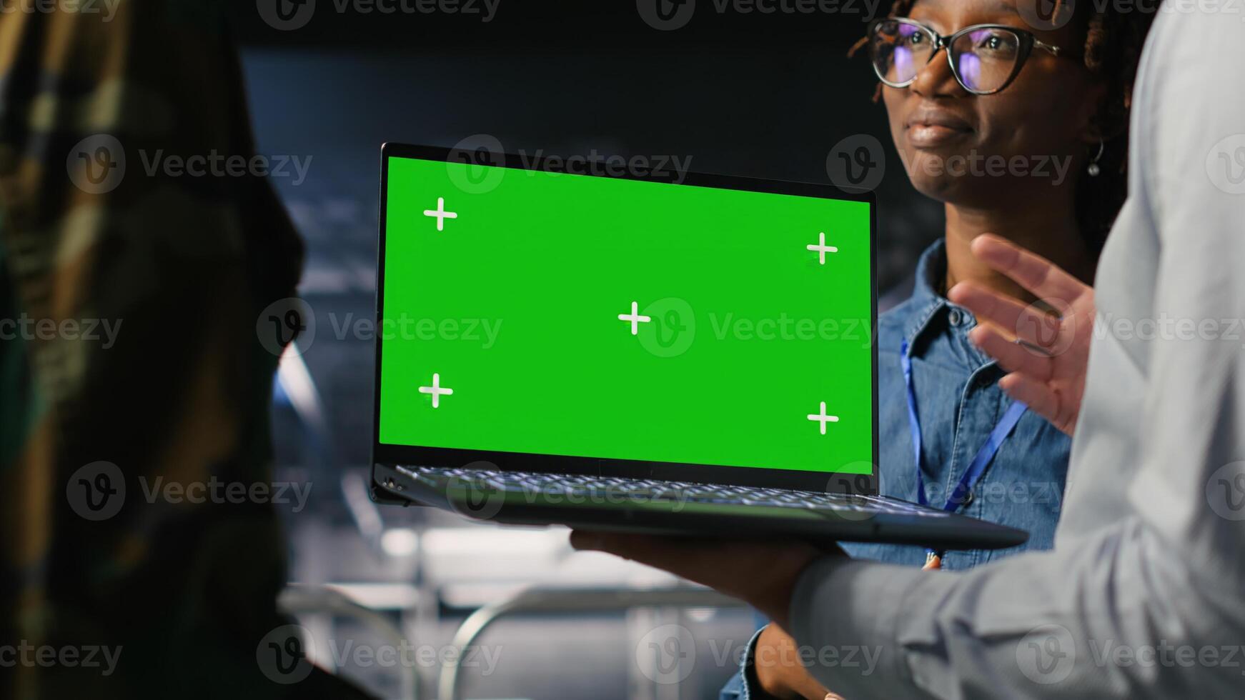 Army engineering team in command center server hub using mockup laptop to install and maintain IT systems. Military data center admins overseeing information systems with chroma key notebook Pro Photo